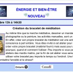 Création du bracelet de méditation : Responsable : Céline Lafrance et Jeanne Lamarche Explorez ces ateliers interactifs pour comprendre votre énergie divine et aspirer à un mieux être. , ...