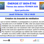 Suite à plusieurs demandes, je vais reprendre l’atelier sur la « Création du bracelet de méditation » jeudi 19 février 13h à 14h30. Si vous avez manqué l’atelier du mois d’octobre dernier ou si vous connaissez une personne qui pourrait en bénéficier, veuillez partager cette affiche. Vous pouvez me ret , ... - 20Matin LibreSculpture sur bois – 1229:00 am - 12:00 pm