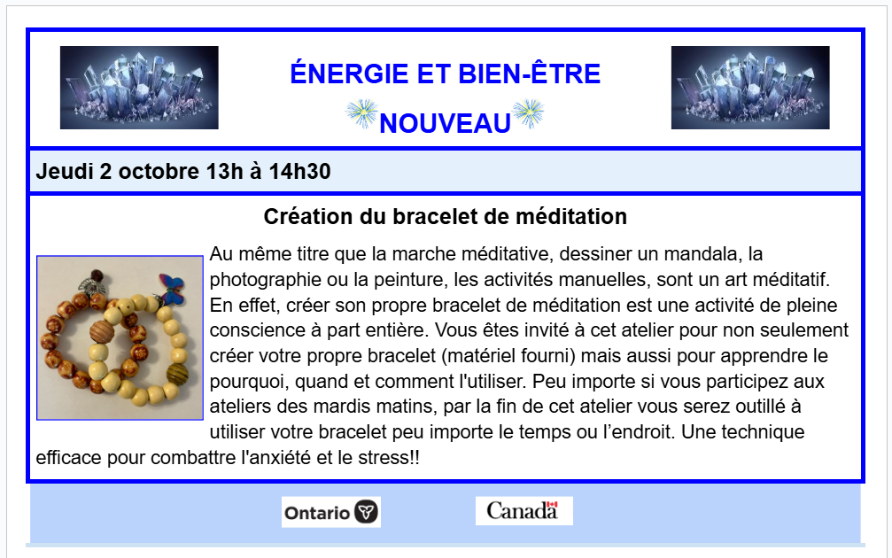 Création du bracelet de méditation : Responsable : Céline Lafrance et Jeanne Lamarche Explorez ces ateliers interactifs pour comprendre votre énergie divine et aspirer à un mieux être.