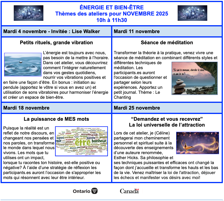 Responsable : Céline Lafrance et Jeanne Lamarche Explorez ces ateliers interactifs pour comprendre votre énergie divine et aspirer à un mieux être.