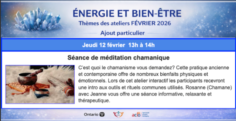 Énergie et bien-être – 124 + Ajouter à mon Agenda Google + iCal / Outlook export 00 jours 00 heures 00 minutes 00 secondes Date Fév 12 2026 Heure 1:00 pm - 2:00 pm Lieu Centre Charles-Émile-Claude 146-B Avenue Chevrier, Cornwall (Ontario) K6H 1S1 Organisateur Centre Charles-Émile-Claude (Cornwall) Téléphone 613-360-0824 Email ldjohnson@sympatico.ca Partagez cet événement