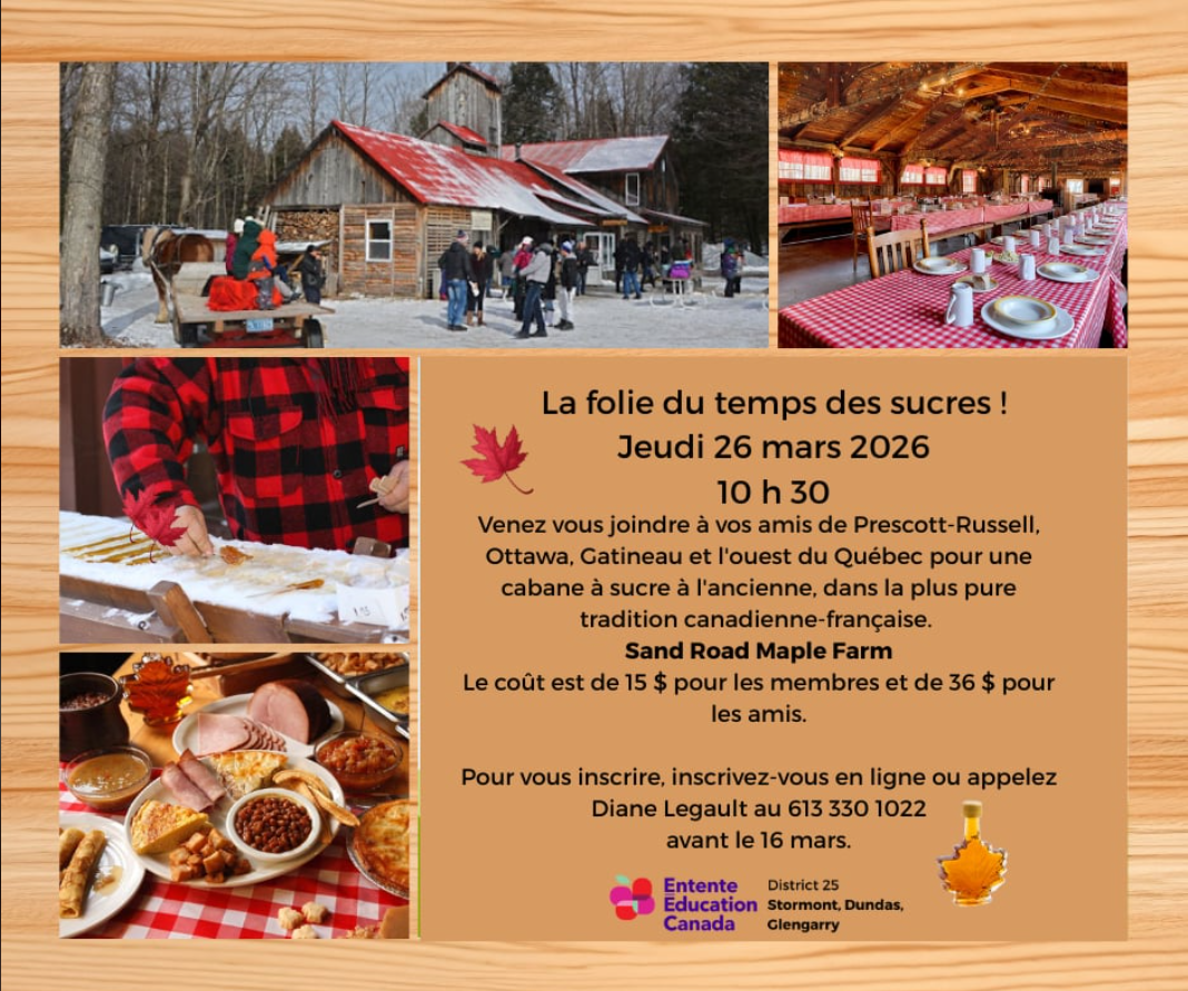 Vous pouvez également vous inscrire en appelant Diane Legault au 613 330 1022 avant le 16 mars.