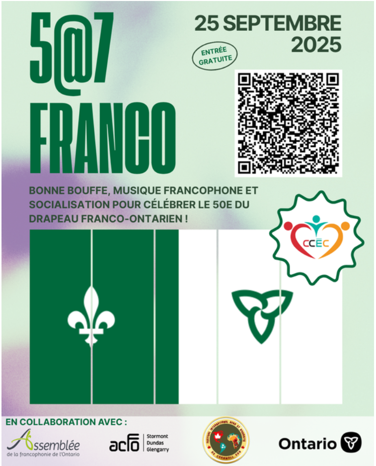 Joignez-vous au CCÉC, à l’ACFO SDG et au Festival International Afro et Diversité de Cornwall SDG pour célébrer en grand le 50e anniversaire du drapeau franco-ontarien.